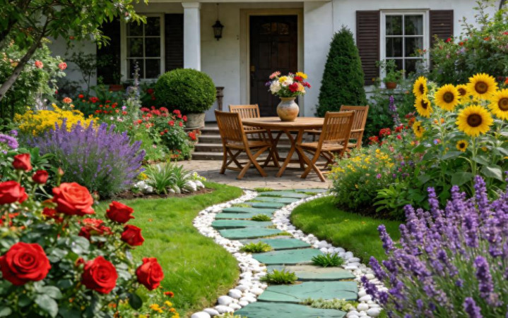 庭院色彩也是影响庭院景观设计风格的因素之一。对色彩规划的一个技巧是根据建筑色彩与周围环境确定庭院的主色调。